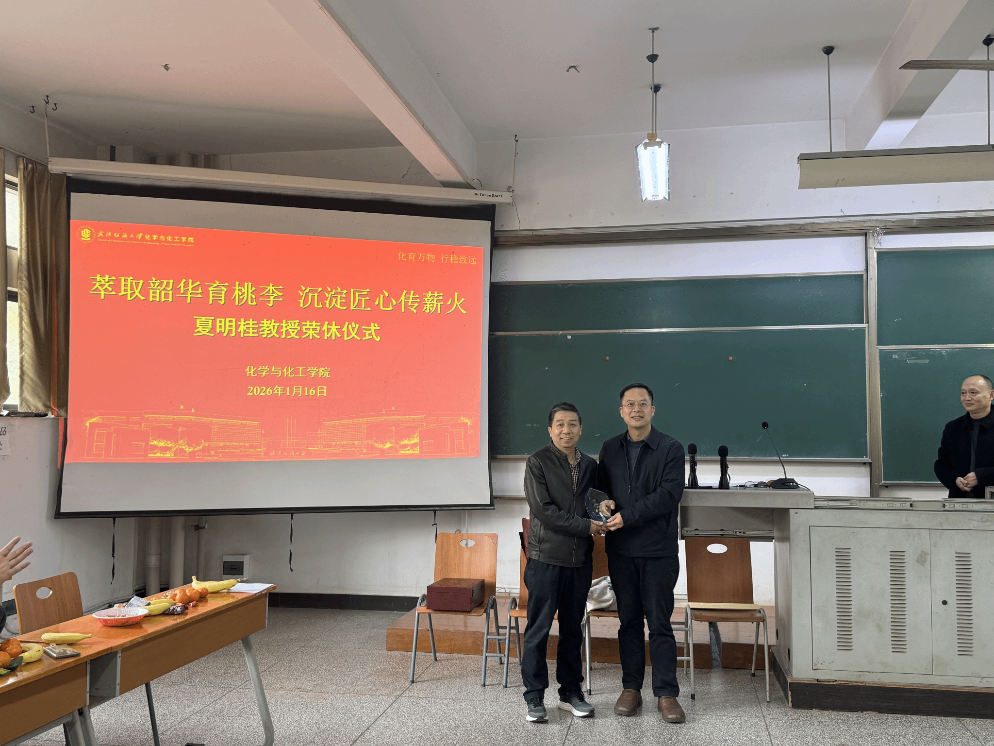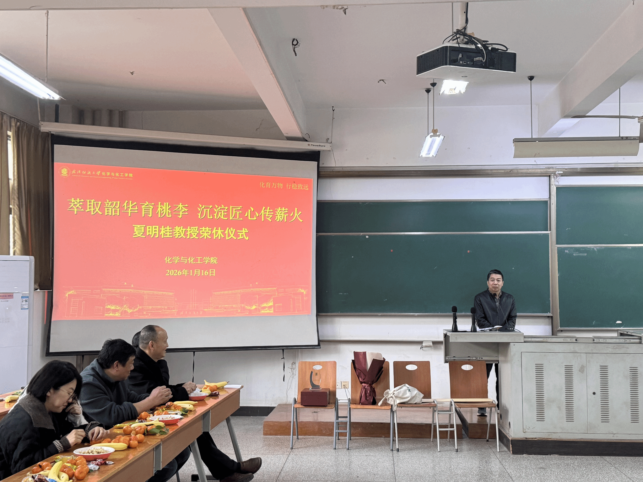仪式现场,化工系主任张然代表全系教师向夏明桂教授送上了精心准备的纪念品,承载着同事们对他的深厚情谊与崇高敬意;青年教师朱芯娅代表青年一代献上鲜花,传递出对前辈的感恩与传承之志。